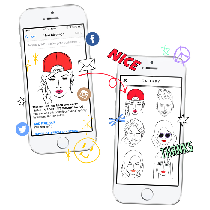 ”MINE” A PORTRAIT MAKERで作られた似顔絵は、SNSアイコンはもちろん、友達や恋人と作りあって遊んだり、メッセージカードとして使うことが出来、使い方は様々です。