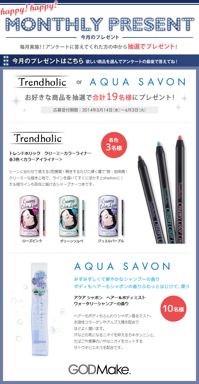 日本最大級のメイク動画サイト「GODMake.」では、5月14日より、抽選でお好きな商品が当たるプレゼントキャンペーンをスタートしました。