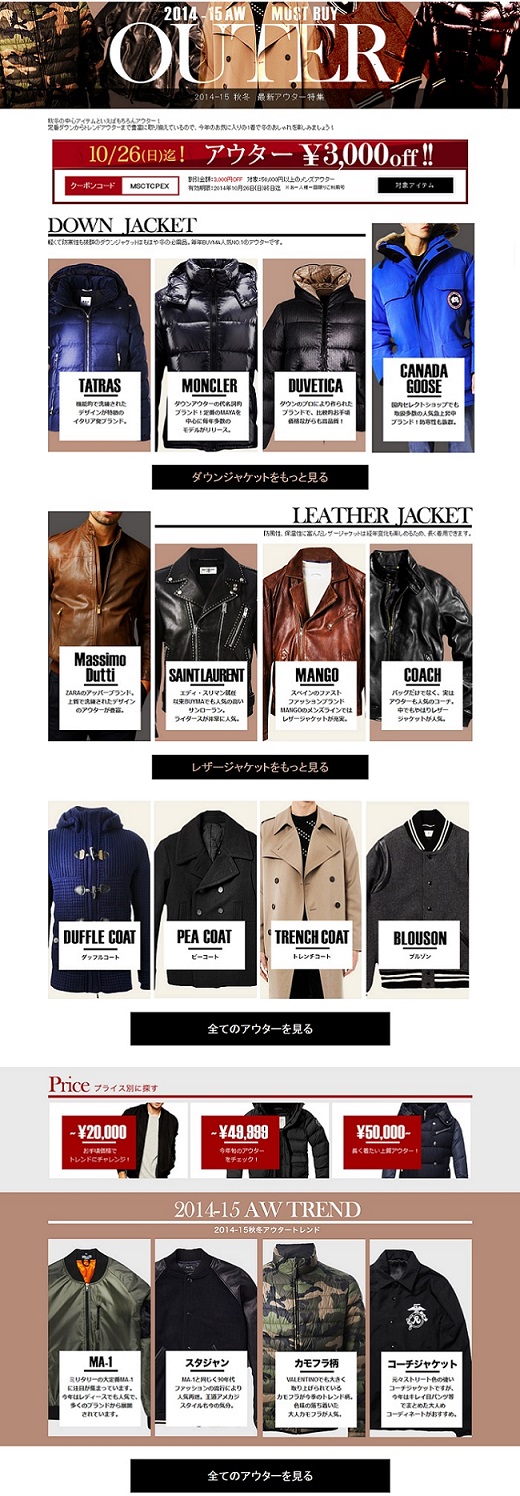 肌寒い季節になり、需要がますます高まるアウター。定番のダウンやピーコートに、海外ブランドのお洒落なレザージャケットなど、種類も豊富です。また今年トレンドの「MA-1(軍用モチーフのフライトジャケット)」や「ブルゾン」も人気です。学生から社会人、カジュアルからフォーマルまで着られる、充実した品揃えを展開しております。なお、本日10月24日(金)から10月26日(日)迄の3日間限定でトレンドのアウターをお得に購入できるクーポンキャンペーンを実施します。(キャンペーン詳細は下記の記載事項よりご参照ください。)