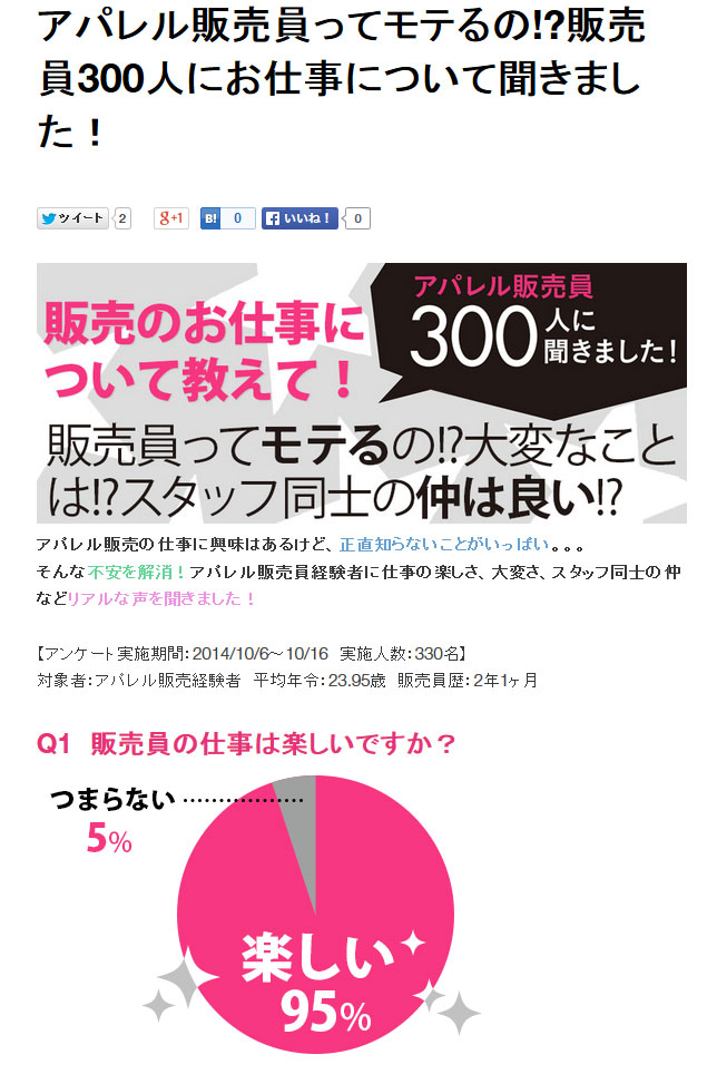 日本最大級1000ブランドのアパレル求人を掲載する(2014年12月9日現在)オシャレ求人サイト『ガールズウーマン』が、アパレル販売経験のある女性を対象に【アパレル販売員の働く環境について】の調査を実施致しました。