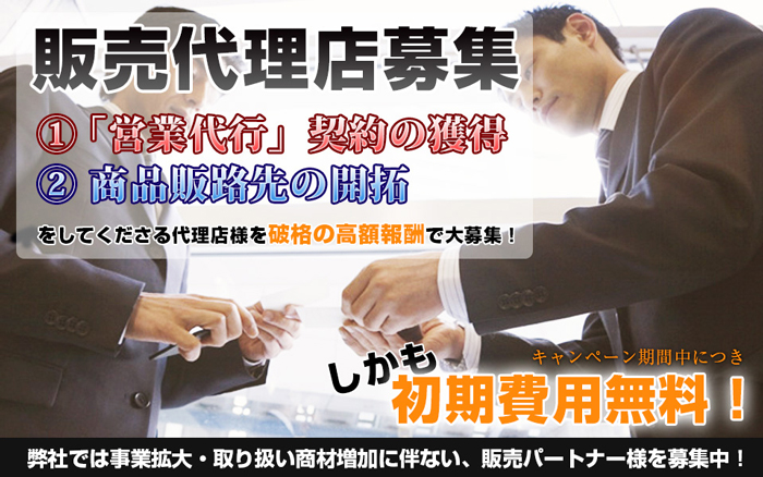 今回は「営業代行契約」の獲得パートナー様、「販売販路先」の開拓パートナー様の募集となり、費用・初期費用なしで始めることが可能です。