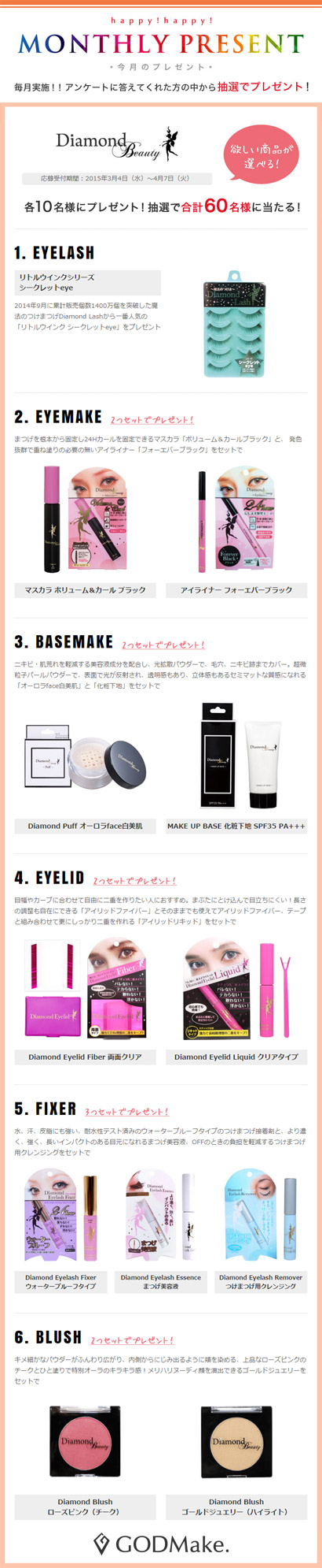 日本最大級のメイク動画サイト「GODMake.」では、3月4日より、「Diamond Beauty」の人気商品が抽選で合計60名様に当たるプレゼントキャンペーンを実施中です。