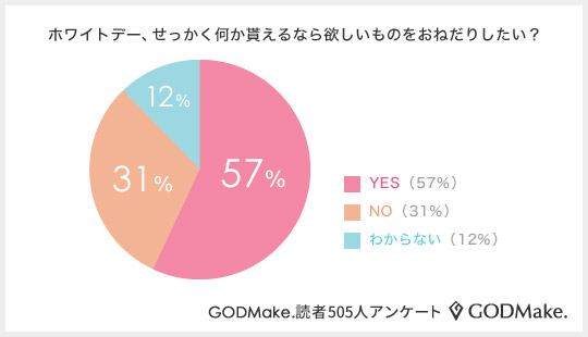 日本最大級のメイク動画サイト「GODMake.」では、2015年2月4日~2015年3月3日までの期間、ホワイトデーに関するアンケートを実施しました。回答者は、GODMake.ユーザーの女性505名です。