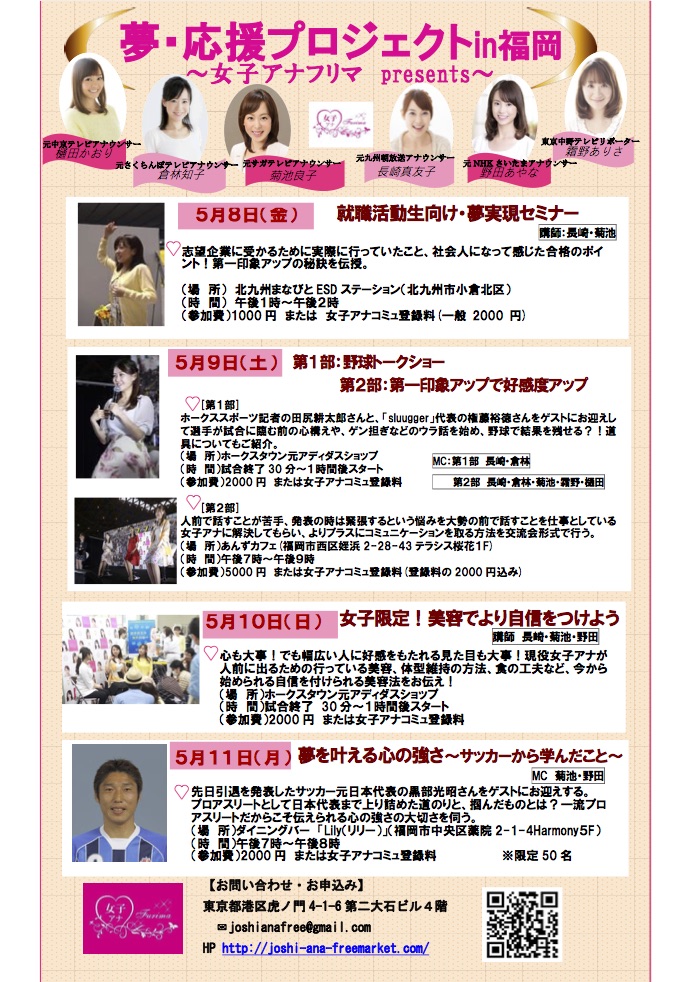 内容)元中京テレビアナウンサー樋田かおり、元サガテレビアナウンサー菊池良子、元さくらんぼテレビアナウンサー倉林知子、元九州朝日放送アナウンサー長崎真友子、フリーアナウンサー霜野ありさを講師に、「人前で緊張してしまう」「自信を持ってプレゼンができない」「初対面の方に会う時には好印象を持たれたい」…などの悩みを解決し、よりよくコミュニケーションを取る為や、自分に自信を持つためにアナウンサーが実践していることなどのセミナーを交流会形式で行う。