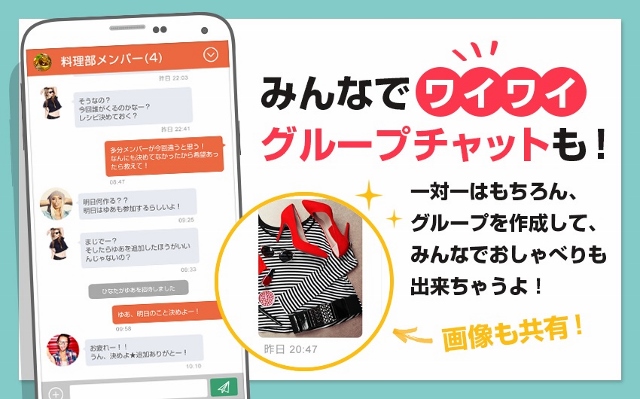 グループトーク、写真や画像の送受信機能も搭載しています。