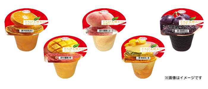 今回、「みかんジュレ」「白桃ジュレ」「ぶどうジュレ」「マンゴージュレ」「ミックスジュレ」の5品を発売致します。