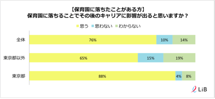 保育園に落ちた経験があるキャリア女性に「保育園に落ちることでその後のキャリアに影響が出ると思うか」について質問したところ、 東京都在住の方は88%が「思う」と回答し、 東京都以外に在住の方は65%が「思う」と回答しました。 保育園に落ちることでキャリアを諦めなければいけないと考えている女性が7割以上いることがわかりました。