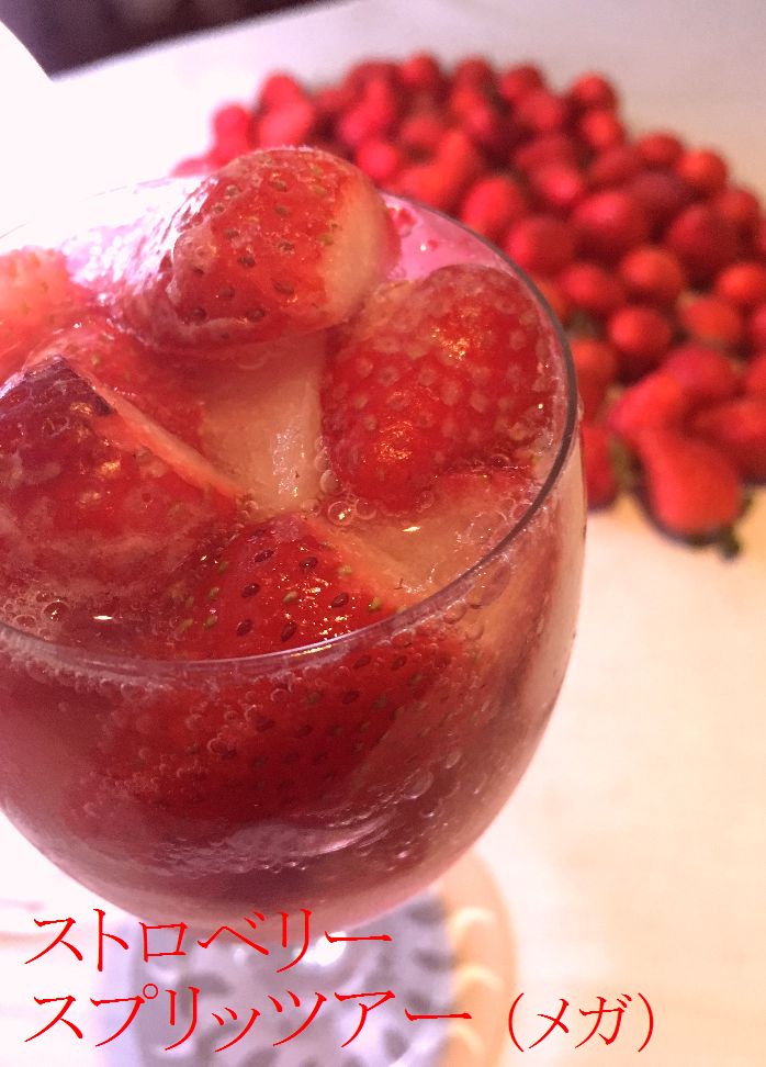 白ワインにイチゴを加え、ソーダで割ったカクテルですが、こちらは何とイチゴの量を「レギュラー」「ダブル」「メガ」の3種類から選ぶことができ、レギュラーでイチゴ2~3粒、ダブルでグラスの半分がイチゴ、メガになると、もうグラスからはみ出るほどのイチゴが入っていて、イチゴ好きにはたまらないカクテルです。