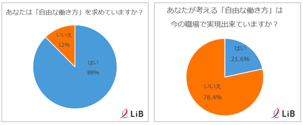 「あなたは自由な働き方を求めていますか?」と質問したところ、「はい」と回答した人が88%、「いいえ」と回答した人が12%でした。また「あなたが考える自由な働き方」は今の職場で実現できていますか?と質問したところ、「はい」と回答した人が21.6%、「いいえ」と回答した人は78.4%でした。約9割のキャリア女性が自由な働き方求めているが、実現できているのはたった2割という結果になりました。