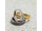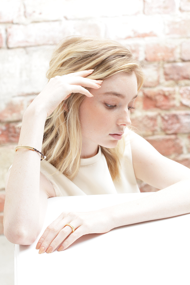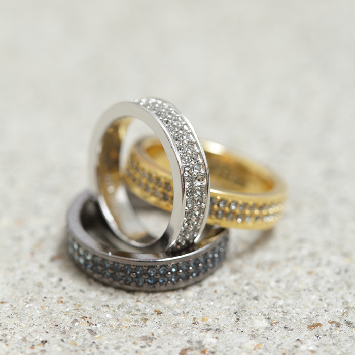 小粒のスワロフスキーを石畳のように敷き詰めたリング。カドのある形状に仕上げ、シャープな印象にしています。