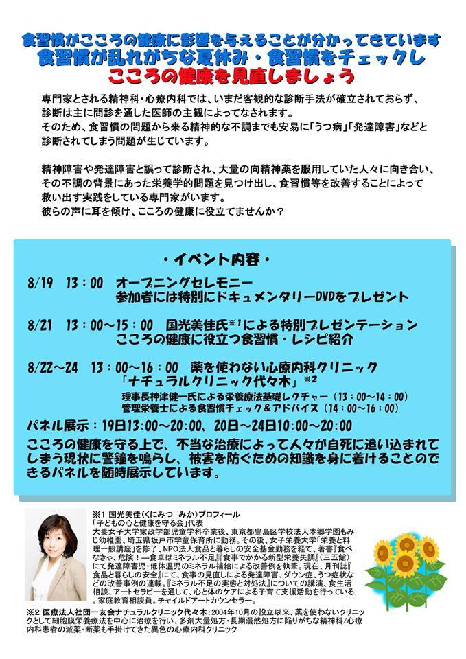心の健康が失われ、不当な治療によって人々が自死に追い込まれてしまう現状に目を向け、市民の人権擁護の会は「夏休み!こころの健康フェスティバル!」を8月19日から24日までの期間中、有楽町駅前地下広場にて開催します。特定非営利活動法人イマジンはこのフェスティバルを応援します。