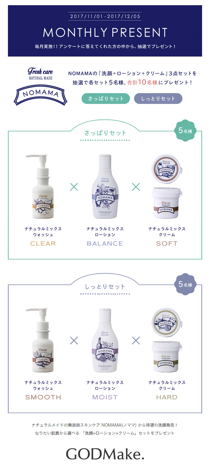 日本最大級のメイク動画サイト「GODMake.」では、2017年12月5日(火)まで、ナチュラルメイドの無添加スキンケア NOMAMA(ノママ) より、待望の発売となった洗顔を含む、「洗顔+ローション+クリーム」の3点セットが抽選で各セット5名様、合計10名様に当たるプレゼントキャンペーンを実施中です。アンケートに答えてご応募ください。
