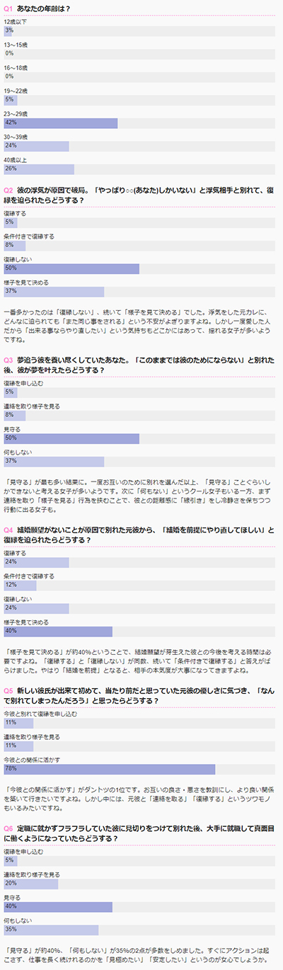 一番多かったのは「復縁しない」、続いて「様子を見て決める」でした。浮気をした元カレに、どんなに迫られても「また同じ事をされる」という不安がよぎりますよね。しかし一度愛した人だから「出来る事ならやり直したい」という気持ちもどこかにはあって、揺れる女子が多いようですね。