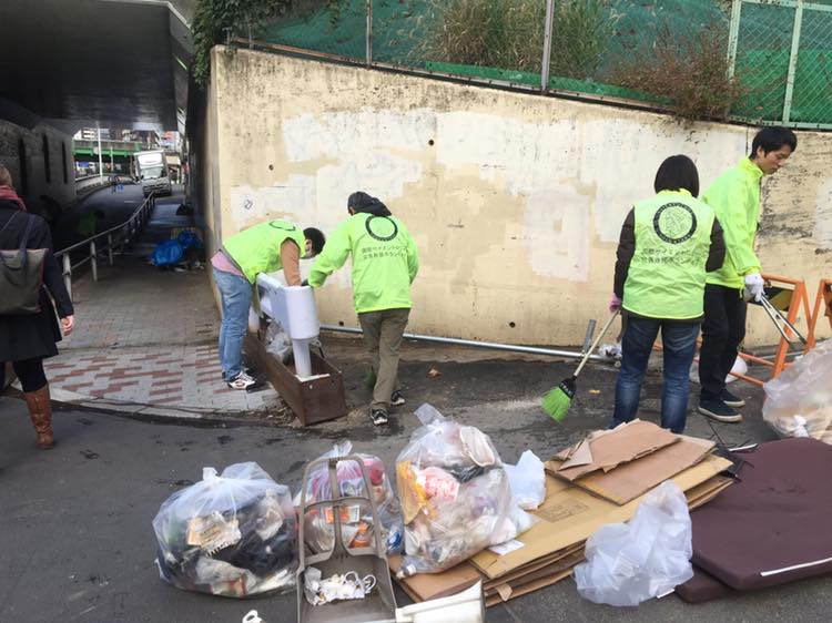 4〜5人ずつのグループに分かれて各エリアを綺麗にします。 清掃内容としては、ゴミ拾い、植込みの雑草除去、カラスによる回収ゴミの散乱の回収、排水溝の詰まりとなるゴミの除去作業、道路のガム剥がし、高架下の落書き落とし等々を行なっています。