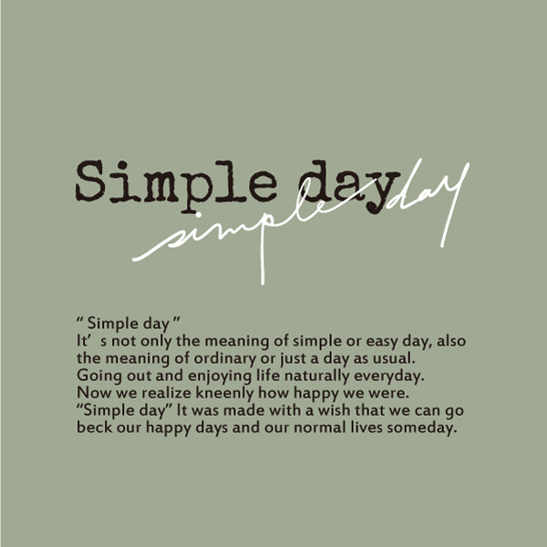 〝simple day” これは簡単な日という意味ではなく、平凡な日、当たり前の日という意味もあります。当たり前のように出歩き、当たり前のように生活を楽しむ。そんな毎日がどんなに幸せな日々だったことか。今私達は痛感していることでしょう。