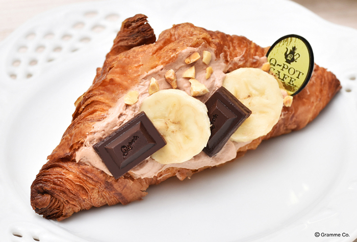 外はサクサク、中はふんわり柔らかいクロワッサン生地になめらかなホイップクリームと、カスタードのコクが絶妙に混ざり合うツインクリームがマッチ。苺やバナナなどのフレッシュフルーツとQ-pot.(キューポット)のロゴ入り板チョコレートでデコレーションしたクロワッサン スイーツサンドは見た目も味もスペシャル。パンとスイーツの中間のスイーツサンドはたっぷりのボリューム感と、スイーツながらも甘すぎない、いいとこ取りがうれしい。