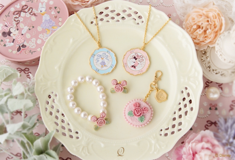 アフタヌーンティーには欠かせない<Cake plate>は、“ミニー”と“デイジー”の2デザインのヴィンテージな雰囲気漂うネックレスで登場。ローズクリームに薔薇の装飾を施したエレガントな<Vintage Cake>は、フラワーガーデンに咲く美しいピンクローズをイメージしたアクセサリー。ハンドメイドの温もりを感じられる本物のケーキのような質感のケーキネックレス&バッグチャームや、コーディネートを上品に彩るホイップクリームのパールブレスレットやピアスなどが登場する。ローズの葉をグリーンのエポキシ樹脂で繊細に表現するなど、Made in Japanでひとつひとつ丁寧に仕上げた上質な逸品。