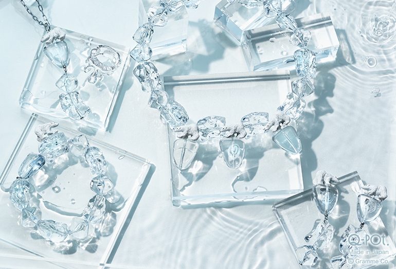 Q-pot. PRODUCTSから登場する<流氷とシロクマ>は、冬の陽射しに煌めくクリアな“流氷”がモチーフ。流氷の上を歩く“シロクマ”がちょっぴりシュールなウィットに富んだアクセサリー。