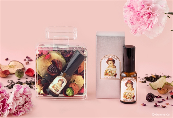 表参道・Q-pot CAFE.(キューポット)とフレグランスメゾン『5W1H』がコラボレーション。優雅でフルーティーな味わいが愉しめるQ-pot CAFE.オリジナル紅茶「flower garden」から着想した、フルーティーでフローラルなオードトワレが誕生。Q-pot. ONLINE SHOP限定で2022年4月23日(土)より発売。