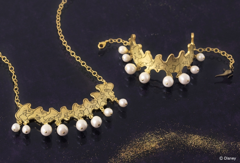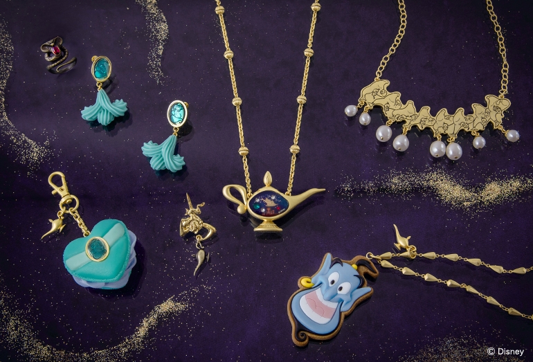 そのほかにも、“アラジン”の相棒の猿で茶目っ気たっぷりの“アブー”をイメージしたピアスや、強い野心を心に秘めた策略家のヴィランズ・魔法使い“ジャファー”がランプの力で巨大な蛇へと姿を変えたシーンを表現したリングやピアスなど、ストーリーテリングなアイテムが集結。Q-pot.のアクセサリーを身に着けて、魅力溢れる『アラジン』の世界に浸ってみて。