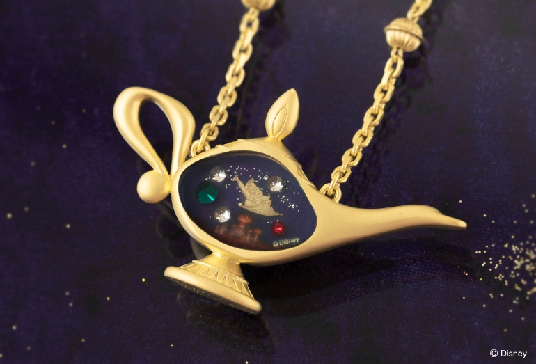 魔法のランプの力でアリ王子に姿を変えた、主人公“アラジン”と王女“ジャスミン”。アグラバーの宮殿を抜け出し、魔法のじゅうたんに乗って輝く世界を駆け巡る二人の姿を封じ込めた魔法のランプは、目が眩むほどにきらめく星の海を、輝くクリスタルガラスで再現。恋に落ちた二人をロマンティックに描いたファンタジックなネックレスに仕上げた。