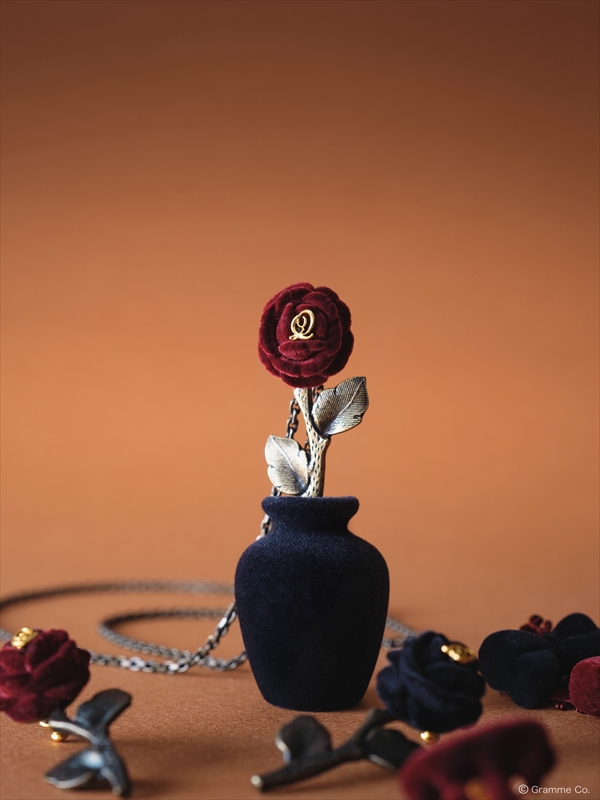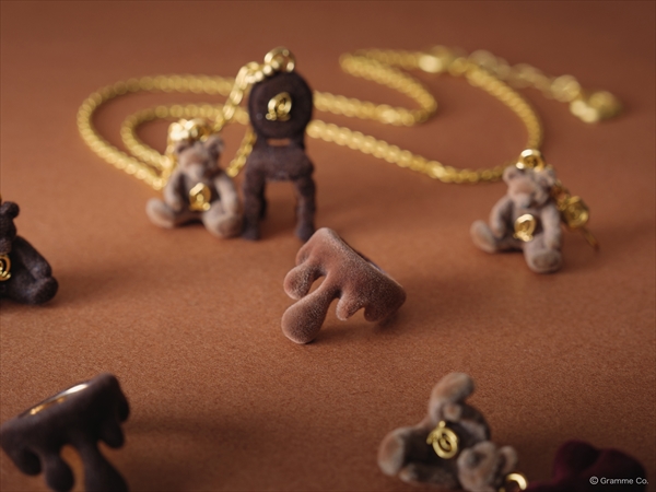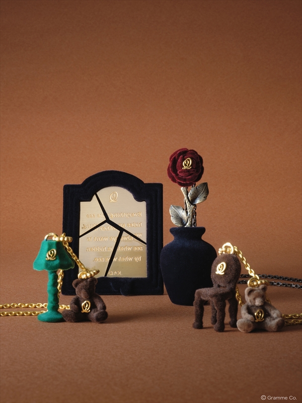 そんなコンセプトから生まれたアクセサリーは、家の中のちょっぴり奇妙な日常を切り取る。ミラーや椅子、ランプ、花瓶にテディベアなど…部屋にある見慣れたモチーフにフロッキー加工を施したネックレスやピアス、ブレスレットなどがラインアップ。