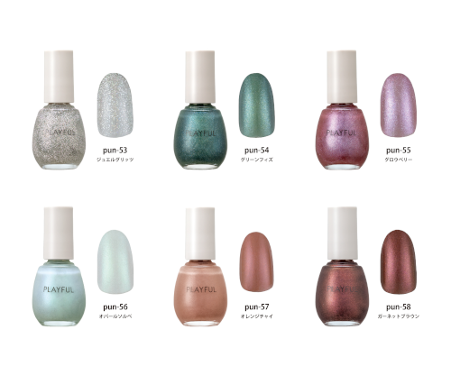 かしこく女℃をアップするネイルブランド「PLAYFUL(プレイフル)」は、塗りムラ知らずの超速乾※2&高発色※2のデパコス級ネイル、「アップデートネイル」から新色を発売します。2026年春夏の新色は、心がときめく甘めなワタシを演出する、6色をご提案。指先に宝石を散りばめたようなきらめき『ジュエルグリッツ(pun-53)』、鮮やかなブルーラメがフレッシュな気分『グリーンフィズ(pun-54)』、甘酸っぱいピンクカラー可愛さを詰めこんだ『グロウベリー(pun-55)』、ミルキーカラーとオパールラメが爽やかな指先に『オパールソルベ(pun-56)』、クリーミーなベージュカラーにスパイシーなラメ『オレンジチャイ(pun-57)』、深みのあるブラウンカラーが濃密な甘い輝き『ガーネットブラウン(pun-58)』pun-53は好きなカラーに重ねてきらめきをON出来る2way仕様。PLAYFULの新色で指先から甘めなワタシに心ときめいて。